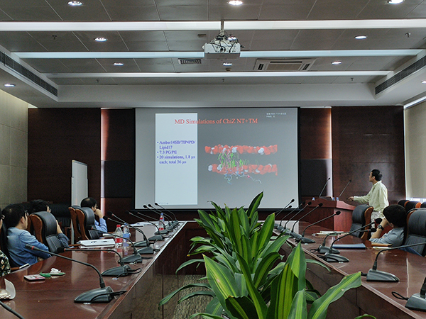 内无序蛋白是蛋白质组学的重要组成部分,它是许多细胞功能的中心,但是对内无序蛋白如何编码其构象集成、构象动力学以及行使的功能这些问题科学家们还了解有限。周教授先以ChiZ(结核分枝细胞分裂机制的一个组成部分)这个膜蛋白为例,使用固态核磁共振揭示N端无序区域的两半之间存在不同的动态偏好;同时以分子动力学模拟的结果解释了这种差异。又以synaptotagmin-1(突触结合蛋白)这个含有内无序区域的膜蛋白为例,介绍了synaptotagmin-1以一个无序区域的相互作用,从而使C2B区域从囊泡膜脱离并向质膜方向结合,从而有可能促进下一步的囊泡和质膜融合。