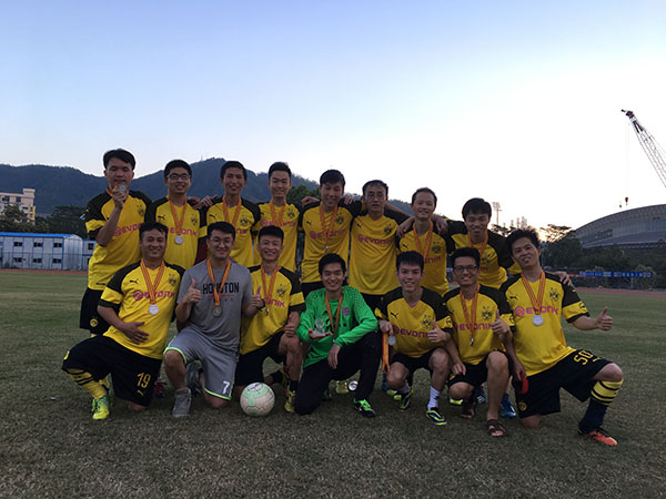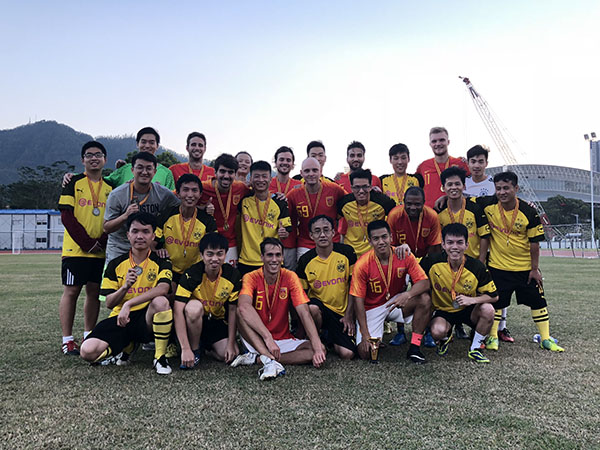 在决赛中,面对实力更高一筹的汇丰留学生队,我院队员并没有畏手畏脚,开场便率先发难,通过角球的机会攻破了对手的大门。然而对手作为卫冕冠军,无论是在身体素质还是技战术配合上都占据着明显优势,通过精准的长传和丹麦前锋的身高牵制,在短时间内连续把握住机会,在半场结束前将比分反超为4:1。我院队员们在落后的情况下,通过中场的认真总结和及时调整,改变了防守策略,顶住了对方在进攻端的不断施压,并通过反击制造机会,将场上比分扳为4:2。比赛的最后阶段双方各有攻守,但都没能改写场上比分,最终我院以2:4不敌汇丰留学生队,获得此次比赛的亚军。我院守门员谢栩杰同学在本届比赛中发挥出色,在小组赛实现三场零封,并在半决赛的点球大战中力保球门不失,获得此次赛事的金球奖。