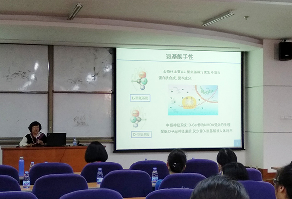 首先,赵玉芬院士举例多种自然界的手性现象,并揭示了手性是自然界的基本特征。赵老师着重介绍氨基酸的手性,生物体主要以L-型氨基酸行使蛋白质合成等一系列生命活动。只有中枢神经系统中,D-Ser作为NMDA受体的生理配基、D-Asp作为神经递质,仅少量D-氨基酸被人体利用。D-Ala嵌入对Abeta构象的影像表明,全部由L-氨基酸构成的Abeta蛋白与替换D-氨基酸(D-Ala)后的Abeta蛋白在溶液状态下构象有明显差别,揭示了D-氨基酸诱导的变异蛋白与老年痴呆、肾病、蛋白质构型变化等多种疾病相关。