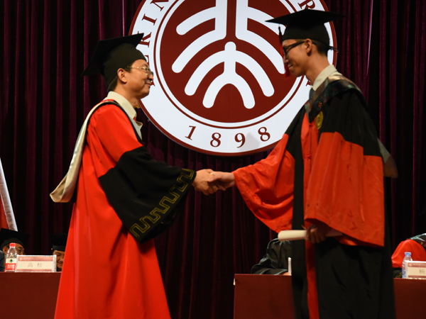 早八时许,我院毕业生在F栋集合前往会场落座。八个学院的祝福视频拉开了典礼帷幕,快闪舞蹈点燃会场氛围,《青春大概》渲染出毕业季的感伤。在热烈的掌声中,与会领导、嘉宾、导师入场,师生佩戴校徽,齐唱《燕园情》。庄严的奏唱国歌环节结束后,毕业典礼正式开始。