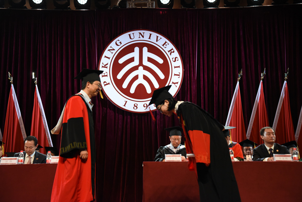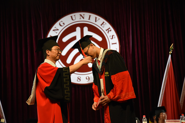 而后,拨穗授位仪式启动。北京大学深圳研究生院副院长、我院院长杨震教授宣读《北京大学关于表彰2018届优秀毕业生的决定》,我院毕业生廖林萍、彭思宇、王珍、吴谦、余敏、张鹏鹏荣获“北京大学优秀毕业生”称号,其中吴谦和张鹏鹏还荣获“北京市普通高等学校优秀毕业生”荣誉称号,高松为优秀毕业生代表拨穗并颁发优秀毕业生证书。北京大学深圳研究生院副院长曾辉教授宣读博士生名单,高松为博士毕业生拨穗。我院副院长周强教授宣读我院硕士毕业生名单,吴云东为硕士毕业生拨穗。