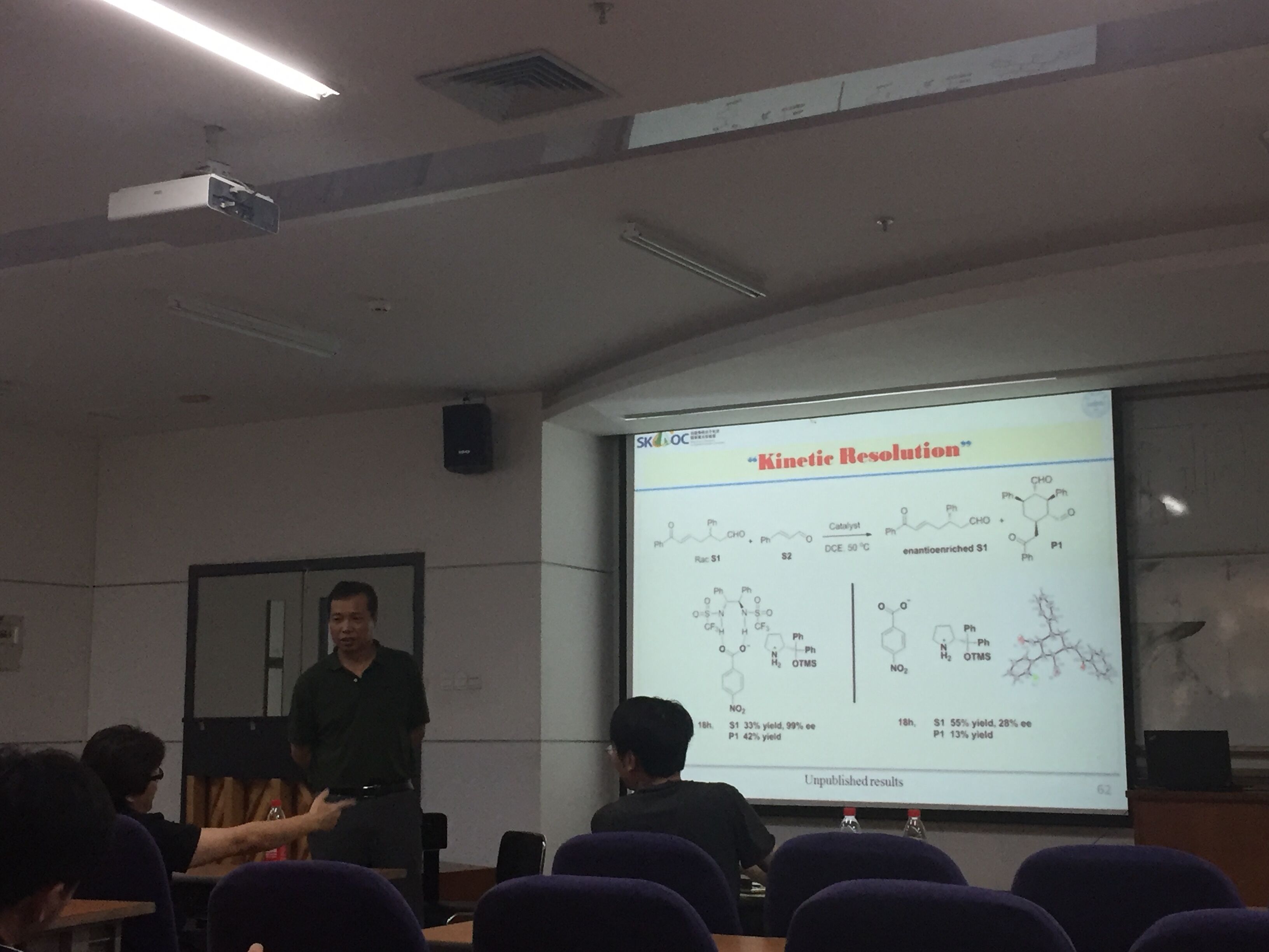 接着,许教授自然而然地从不对称合成过渡到不对称催化,并指出现阶段有机小分子催化所面临的两大挑战:(1)催化剂用量“大”、(2)反应时间“长”;这决定了其很难实现工业化。然后,通过三个部分的详细讲解带我们充分领略有机小分子催化串联反应,超分子亚胺催化及其广泛的应用。第一部分:有机小分子催化串联反应,主要讲述了由于受到大自然的启发,并认识到目前化学工作者对非对映异构体的合成少有涉及,发展了一类利用两个手性催化剂控制四个手性中心,非对映合成手性环己烷的串联反应策略,并通过大量实验找到两个催化剂匹配的情况,得到了6.7:1的d.r.值。第二部分:超分子亚胺催化,与传统的亚胺离子催化不同的是,他们注意到了催化体系中负离子的作用,构建了七种可能的手性控制模式,并设想能否利用氢键作用将亚胺正离子和底物负离子拉开,实验表明反应速率得到加快,进一步通过核磁观察到亚胺离子浓度增加。第三部分:超分子亚胺催化的应用,主要列举了超分子亚胺催化在五个方面的应用:1. 傅克反应; 2. 狄尔斯-阿尔德反应; 3.迈克尔加成反应; 4.插烯加成反应; 5.动力学拆分; 并分别提出相应的反应机理。