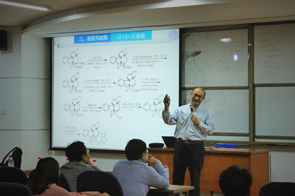 报告中,唐勇院士首先回顾了自己的学术成长历程。他说,在长期的科学研究实践中,逐渐培养了自己对亚烷基丙二酸酯的研究兴趣,形成了自己的研究理念。近几年,多取代环丙烷在手性路易斯酸催化下的不对称开环反应的报道越来越多,为许多复杂天然产物中骨架的构建提供了简单易行的新思路,唐勇院士首先介绍了其课题组在环丙烷不对称开环上的部分工作,在合成天然产物Tetracyclic Spiroindolines的过程中,其研究团队发现改变环丙烷酯基上的R基团,可以得到一对构型相反的非对映异构体,并通过理论计算为该实验现象提供了依据,让同学们认识到酯基上基团能对该[3+2]环化反应实现远程手性调控。在对亚甲基丙二酸酯的新反应研究中, 唐勇院士提出通过[2+2]和[2+2+2]反应构建吲哚生物碱类天然产物的核心骨架结构,该关键反应在实验室操作通常能以高收率、高非对映选择性、高ee值实现,大大突破了常规的实验室合成方法,具有很大的借鉴参考价值。唐勇院士利用该类反应先后完成了11-demethoxy-16-epi-myrtoidine和(+)-Piperarborenine B等化合物的全合成。在尝试完成天然产物11-demethoxymyrtoidine的全合成的过程中,最后一步分子内Heck反应尝试多次均未能实现,唐勇院士猜测可能原因是远程氮原子上的甲基保护基影响了整个分子的立体构型。最后改用AIBN和nBu3SnH虽然实现了该分子内环化反应,得到的却是一个手性中心相反的11-demethoxy-16-epi-myrtoidine,我院翟宏斌老师在之后的提问环节中提出先迁移双键再进行自由基环化可能可以有效地避免这个问题。报告结束后,学院老师和同学与其进行了激烈的交流与讨论。唐勇院士还分享了自己对于学术研究的心得。他说,没有基础研究,没有密切合作,就没有真正的高新技术,要相互尊重,相互欣赏,包容共进,合作共赢。在报告最后,唐勇院士鼓励与会同学要不断提高科技创新能力,要做到“复杂的东西简单做,简单的事情坚持做,坚持的事情用心做,相信大家将来一定会为中国的科学技术进步做出自己应有的贡献。(文字/刘栋,摄影/黎黎)