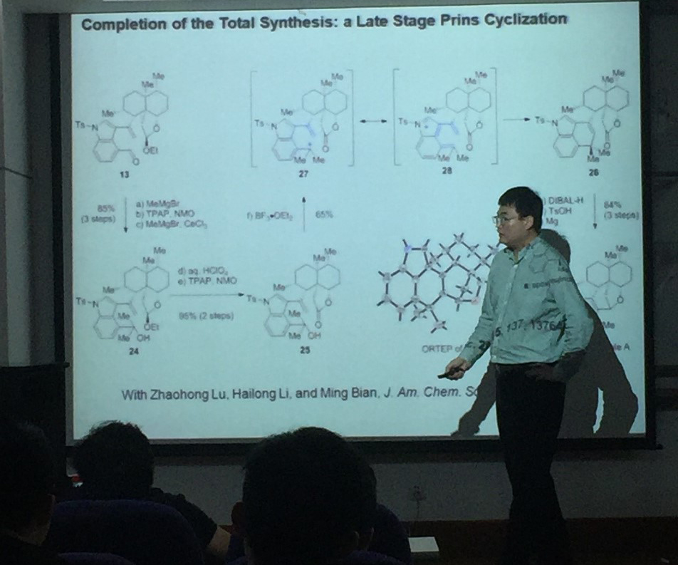 2016年11月17日,中国科学院上海有机化学研究所李昂研究员应我院黄湧老师的邀请,在E-104报告厅做了一场题为“天然产物合成中的普林斯环化反应”的精彩报告,我院师生积极与其进行学术交流和讨论,受益匪浅。