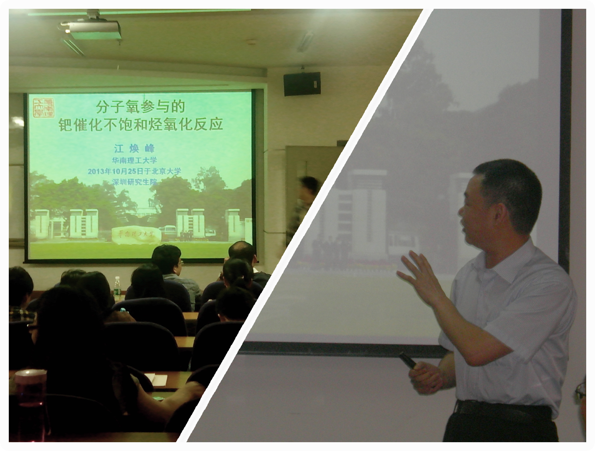 在当天的学术交流中江焕峰教授主要介绍了近十五年来其所带领的科研团队在钯催化的分子氧做氧化剂的绿色化学,新型有机反应方面的科研成就,并与大家分享了多年的科研思路和对有机化学的独到见解。江焕峰教授与大家讲述了其团队在不断地科研探索中取得的一些心得体会并向各位参会老师和研究生同学介绍了其研究小组一些最新的钯催化方面的研究结果。江焕峰教授出色的报告深深地吸引着老师和同学,报告的最后各位老师同学更适于江焕峰教授进行了热情的讨论和交流,整个会场充满了积极活跃的学术气氛。