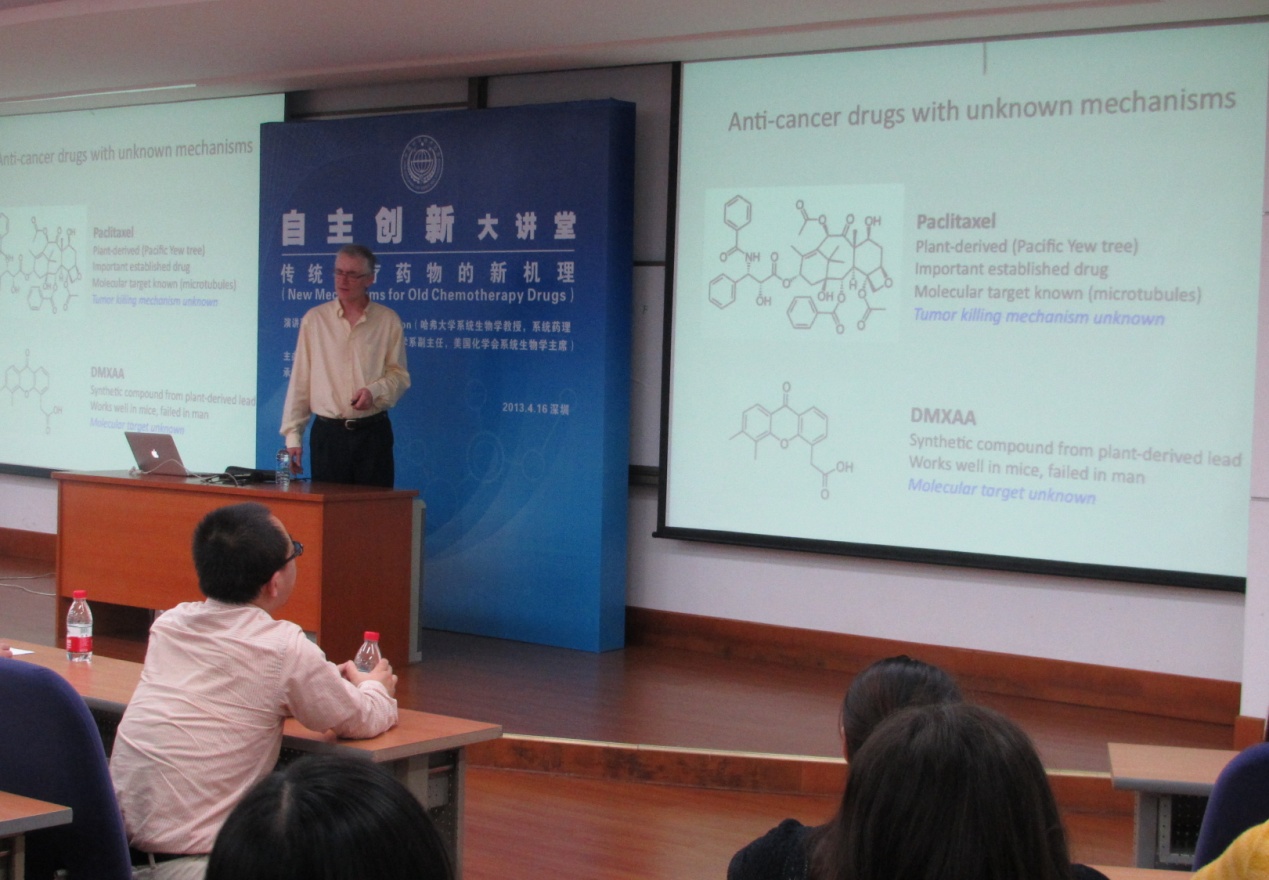 2013年4月16日,我院杨震教授邀请到来自哈佛大学医学院的Timothy Mitichison教授来我院进行学术交流,并于下午两点在E104为全院师生带来了精彩的学术报告。Mitichison教授以“New Mechanisms for Old Chemotherapy Drugs”为题介绍了传统化疗药物的新作用机理,其天才般的思维让我们为之惊叹。Timothy Mitichison教授可以被称为“化学生物学之父”,他于1997年与著名有机化学家Stuart L. Schreiber在哈佛医学院共同创办了化学与细胞生物学研究所,从而首次创造性地将化学家与生物学家有机结合到一起。2004年,Mitichison教授又创办了系统生物学学院,旨在细胞水平上研发药物。更多相关介绍可参见其课题组主页。