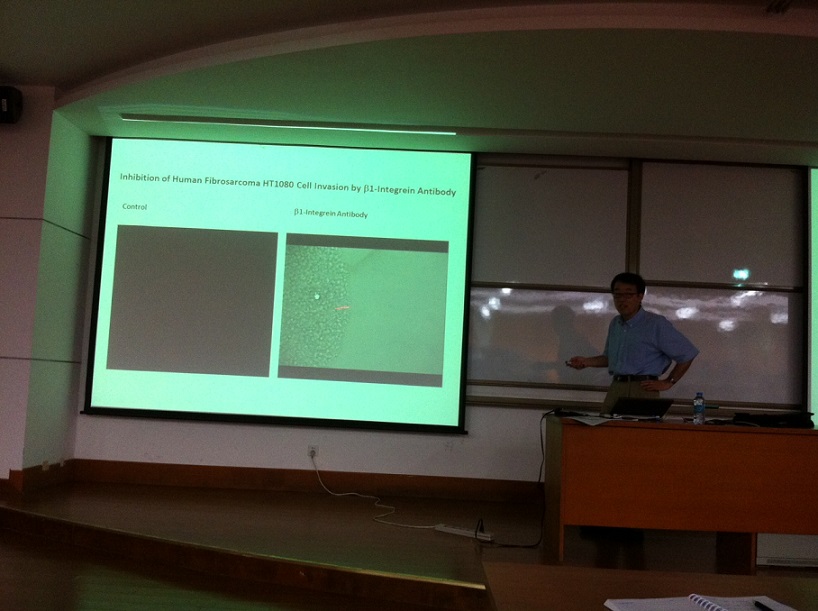 美国石溪大学曹鉴教授应我院赵劲教授邀请,于2013.6.17下午16:00在E-104作了一场精彩的学术报告,题为“Matrix Metalloproteinases (MMPs) in Cancer Metastasis: Developing Novel Inhibitors Targeting Cancer Cell Invasion”。曹教授致力于抗癌药物的研发,对抗癌药物的研发有其独到的见解,并以“瞎子摸象”为比喻,概括了目前抗癌药物研发的局限性。曹教授很喜欢我院学生,思维活跃、性格开朗,并且也非常愿意与化学方向的教授进行课题上的合作。曹教授也非常欢迎我院同学毕业后到他的课题组做博后,有意愿的同学可以通过email联络曹教授。