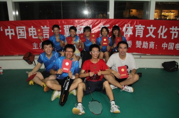 2012年10月24日至10月26日,在G栋羽毛球馆举办了北京大学深圳研究生院“中国电信天翼杯” 新生体育文化节羽毛球赛,我院羽毛球健儿勇夺冠军。此次新生体育文化节羽毛球赛,我院队伍由王飏、汉京春、郭益安、沈辰、林华灿、周丽艳、成贵娟、刘启颂、张云、赵若荷10名同学组成。经过抽签,我院被分到A组,分别与汇丰商学院2队、教工队、人文社会学院、信息工程学院2队进行小组争夺,最后以小组第二进入半决赛。26日的半决赛中,我院对对战环境与能源学院。男单比赛中,我院汉京春以21-3,21-5轻松胜出。在男双与女双比赛的激烈争夺下,我院羽毛球健儿均胜出。虽然在女单比赛中,我院不及环境与能源学院, 但我院已以总比分3-1领先,在混双比赛之前,我院胜出已成定局,因此环境与能源学院放弃了混双比赛。在随后对战的教工队比赛中,教工队胜出,但是教工队不参与此次比赛的名次排名,所以我院在战胜环境与能源学院后就已夺此次北京大学深圳研究生院“中国电信天翼杯” 新生体育文化节羽毛球赛冠军。
