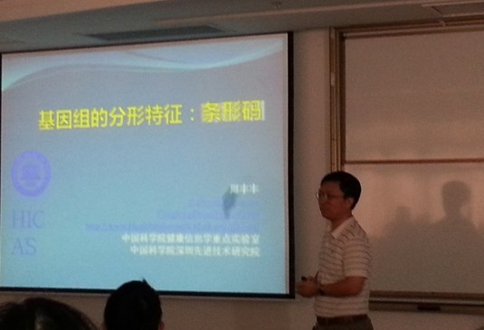 2012年12月7日,中国科学院深圳先进技术研究院周丰丰教授应我院李子刚老师的邀请来我院进行访问交流并与师生进行了热烈的讨论交流。下午两点,周丰丰教授在北大C303举行了学术报告会,报告会由李子刚老师主持。李子刚老师对周丰丰教授的来访表示了热烈欢迎,并对周丰丰教授的学术背景与研究简历作了介绍。周丰丰教授作了题为“基因组的分形特征:条形码”的学术报告。报告由自然界物种局部与整体的关系引出了周丰丰教授所研究的“条形码”技术对于基因分形特征的规律以及潜在的研究价值作了深入的讲解,并与在场计算化学专业的学生开展了热烈的讨论,包括技术的应用领域以及算法的相关问题,极大地开拓了同学的视野。