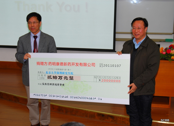 药明康德新药开发有限公司人力资源部执行主任黎健博士代表药明康德向学院捐赠了20万元的奖学金,吴云东院士代表学院接受了奖学金支票。