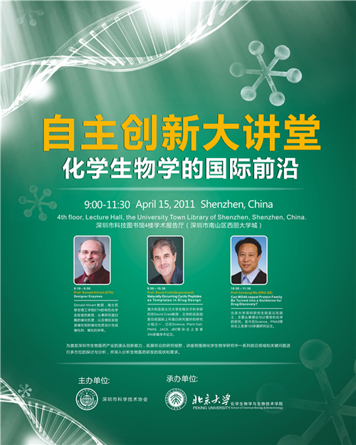 由深圳市科学技术协会主办北京大学深圳研究生院承办的“自主创新大讲堂——化学生物学的国际前沿”学术报告会将于2011年4月15日(星期五)上午9:00-11:30,在深圳大学城图书馆隆重举行。为激发深圳市生物医药产业的源头创新能力,拓展听众的研究视野,讲座将围绕化学生物学研究中一系列前沿领域和关键问题进行多方位的探讨与分析,并深入分析生物医药研发的现状和需求。讲座已邀请到瑞士苏黎世理工学院ETH的有机化学实验室的Donald Hilvert教授,澳大利亚昆士兰大学生物分子科学研究所David Craik教授,北京大学深圳研究生院吴云东院士,预祝本次大讲堂圆满成功。