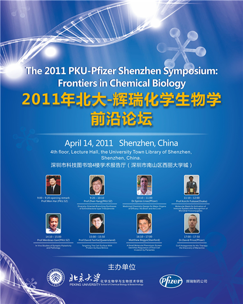 此次“2011年北大-辉瑞化学生物前沿论坛”是一次大型的国际研讨会,为期两天(2011年4月14-15日),对于扩大北大深研院药物研发在国内乃至国际的影响力具有积极作用。将围绕化学生物化学生物学研究中一系列前沿领域和关键问题进行多方位的探讨与分析。论坛邀请了近20名国内外基础与临床以及药物设计等方面的专家进行报告交流(详见会议网站)论坛已邀请到了吴云东院士(北大深圳研究生院副院长)、杨震院长(北大深圳研究生院化学生物学和生物技术学院院长)、邓子新院士(中国科学院院士、现任武汉大学药学院院长兼武汉生物技术研究院院长)、Donald Hilvert教授(瑞士苏黎世联邦理工学院)、Koichi Fukase教授(日本大阪大学)、David Fairlie(澳大利亚昆士兰大学)、David J Craik教授(澳大利亚昆士兰大学)、David Anthony Price博士(辉瑞资深总监)、Matthew Bogyo教授(美国斯坦福大学医学部)等。届时将有辉瑞等国际知名的药企,为大家展示化学生物制药行业的崭新发展。论坛举行期间,同学们将会有更多的机会与专家、教授进行进一步的接触和交谈,切身了解国内外的生物化学研究前景。