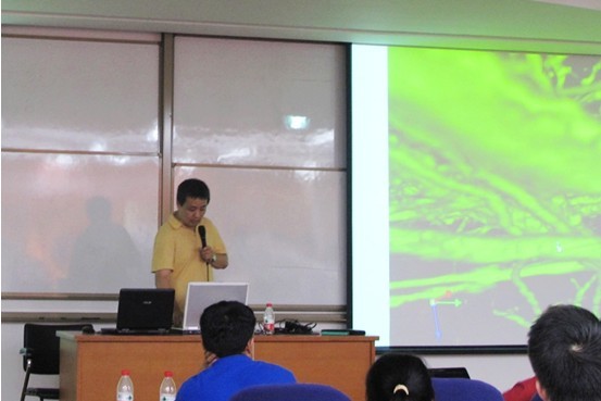 甘文标教授首先就神经生物学领域利用双光子共聚焦显微镜研究活体动物学习、记忆机理展开介绍,甘教授展示的小鼠皮层树突棘可塑性活体成像的成果引起了同学们的浓厚兴趣。