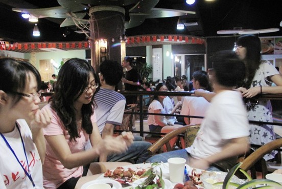 营员在大学论语中与在校师生联欢,一边聊天,一边吃东西,一边做游戏,一边才艺表演,现场异常活跃。