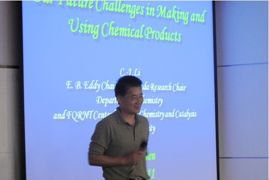 来自加拿大麦吉尔大学的李朝军教授用浅显易懂的例子向同学们生动地介绍了其在绿色化学方面的研究情况。