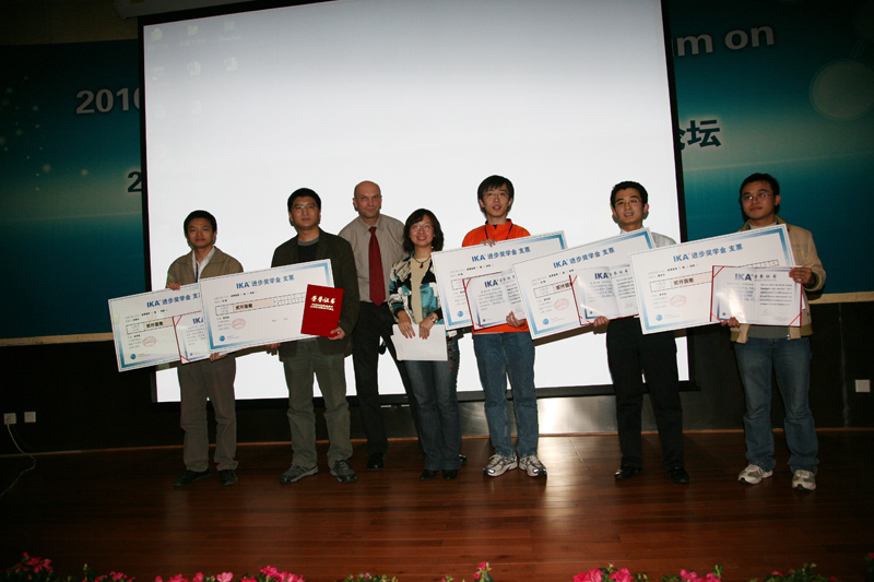 论坛在下午进行了学生报告展示和学生墙报展示,并在会议期间颁发了本年度的“IKA进步奖学金”和“晨兴优秀论文奖学金”, IKA公司总经理Mr. Clause Jacuk 先生和市场部经理李波女士,晨兴集团项目部经理向晶女士分别致辞,并为获奖同学颁发了奖学金。论坛还评选出3名学生报告优秀奖和6名学生优秀墙报奖,分别由周其林教授和王剑波教授颁奖。