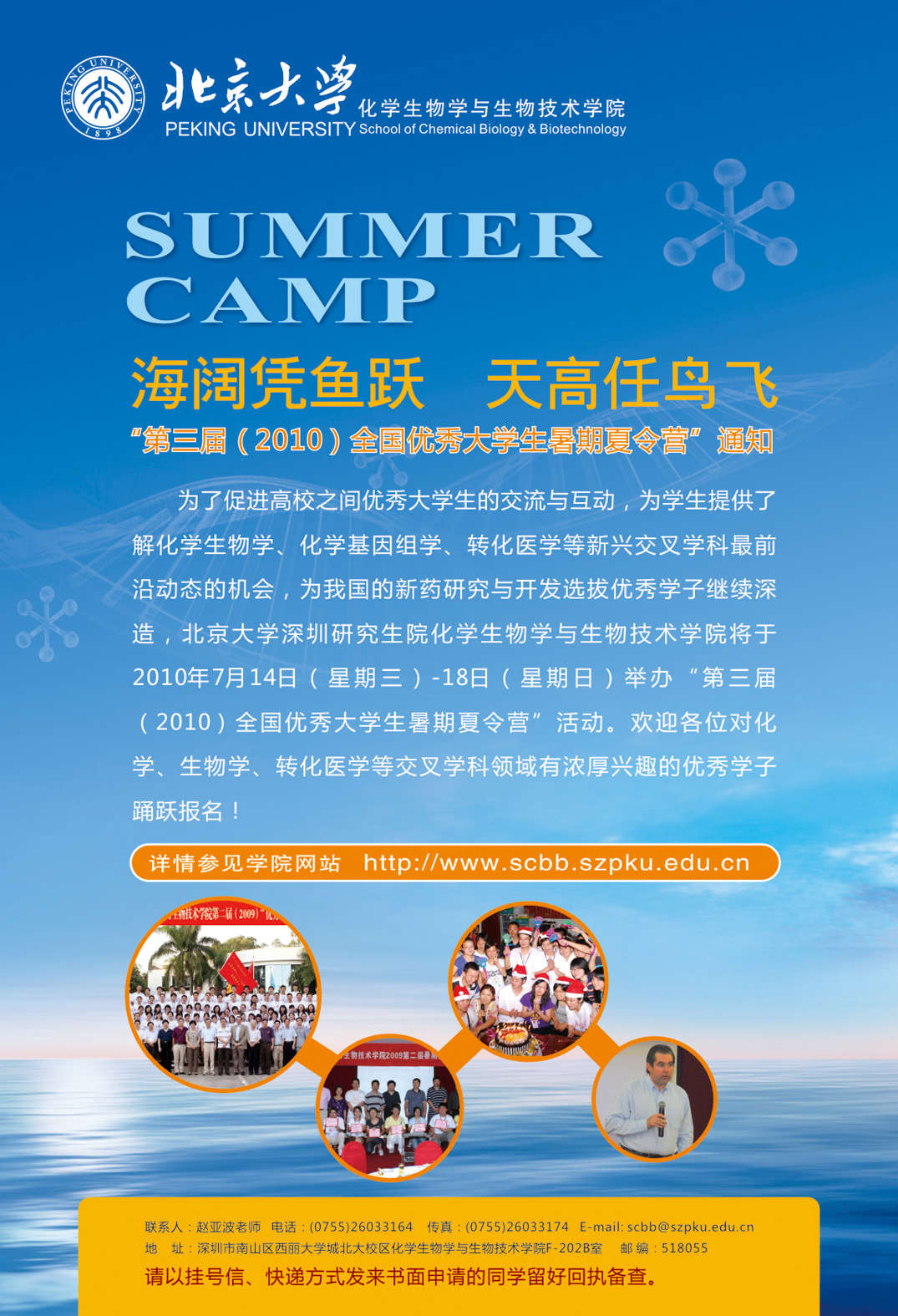 为了促进高校之间优秀大学生的交流与互动,为学生提供了解化学生物学、化学基因组学、转化医学等新兴交叉学科最前沿动态的机会,为我国的新药研究与开发选拔优秀学子继续深造,北京大学深圳研究生院化学生物学与生物技术学院将于2010年7月14日(星期三)-18日(星期日)举办“第三届(2010)全国优秀大学生暑期夏令营”活动。欢迎各位对化学、生物学、转化医学等交叉学科领域有浓厚兴趣的优秀学子踊跃报名!