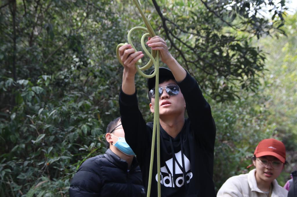 首先,经过了简单的绳结考核,情景考核开始了。在第一个情境中,同学们在野外行进中拦路遇到一条“湍急的河流”,河边有一棵粗壮的树,要求同学们在规定时间内利用绳索和树干,将所有人员和背包安全“渡河”。接到任务以后,同学们迅速对情境展开讨论,用动力绳在树干上建立了保护站,运用学过的绳结知识在动力绳上建立了多个着力点,经过多次尝试后,最终将队员和背包运送至“河对岸”。任务结束后,深圳山地救援队的单桂林老师对同学们的表现做了点评,并针对此情境给出了优化方案。
