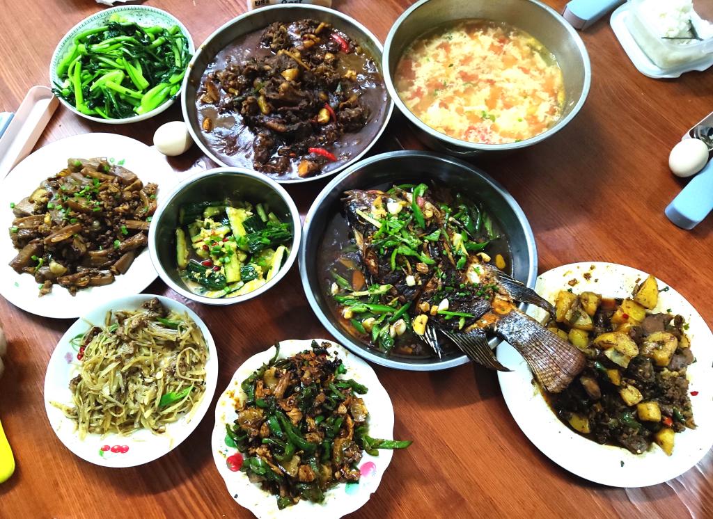晚饭是同学们大显身手的时候。露营地点在一户农家院的院子里,老板提供了食材和厨房,做什么菜由同学们自己商议决定。做饭与做实验有着一定的相似之处,同学们利用给定的食材,发挥想象和各自特长,两组之间合作分工,完成了两桌丰盛的晚餐。不仅有炒土豆丝、蒜蓉黄瓜等开胃菜小菜,也不缺浇汁鱼、大盘鸡等“硬菜”,还有西红柿鸡蛋汤、蒸水蛋等促进消化。一顿丰盛的晚餐为大家解除了一天的疲劳。