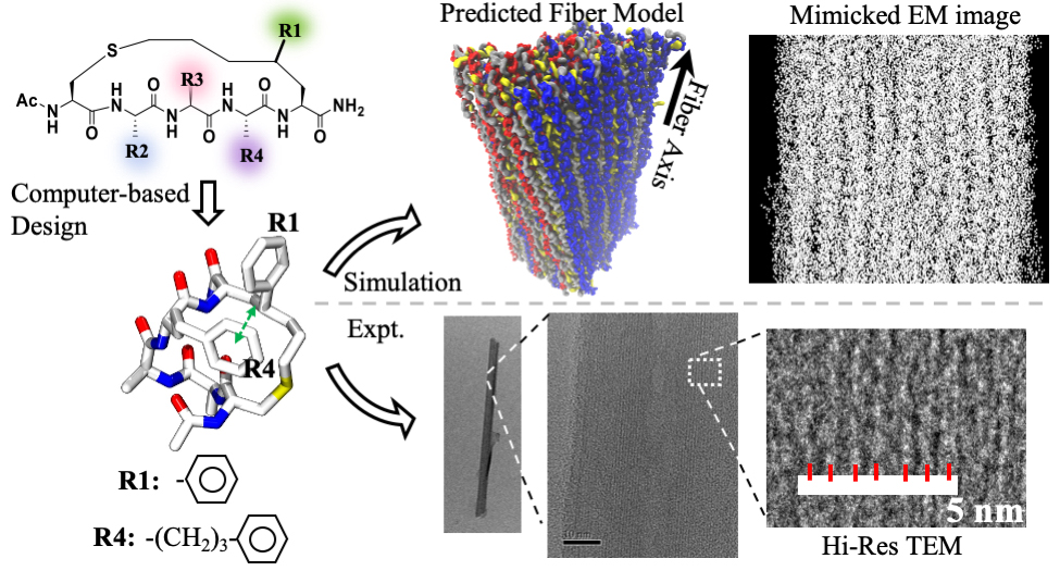 短肽分子具有良好的生物兼容性,且易于合成及修饰,因此已经成为制备自组装纳米结构的一类重要的构建单元。尽管这类自组装结构表现出独特的物理和化学特性,但由于短肽构象的自由度较高,它们往往缺乏特定氨基酸精确的空间排列。通过化学修饰的构象约束为这个问题提供了有效的解决方案。受到天然蛋白质中存在的一类特殊螺旋自组装结构的启发,科学家们致力于探索如何通过设计短肽来构建由螺旋肽形成的超螺旋纳米纤维结构。迄今为止所采用的方法主要是引入使螺旋构象稳定的非编码氨基酸,但这类方法通常会改变多肽主链的化学结构,导致多肽形成的螺旋结构不规则,这使得螺旋肽自组装结构设计和机制理解变得十分困难。所以,基于结构和机制的螺旋多肽自组装的理性设计尚付阙如。