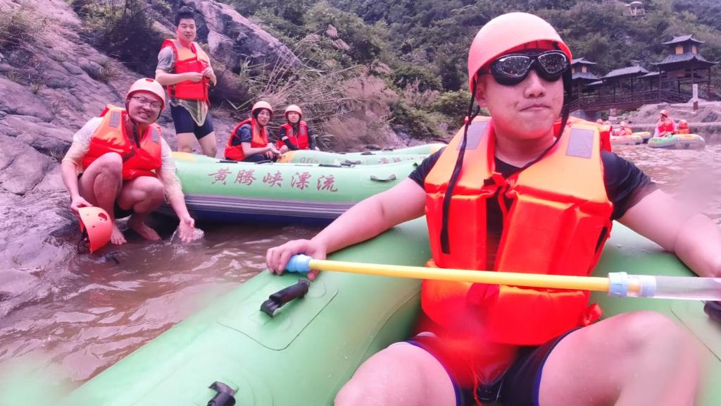 之后师生们便分成两队,在保证安全的前提下,一队人马前往进行漂流。古龙峡漂流被誉为“浪尖上的过山车”,漂流道的平均坡降为9.5%。两人一艇沿着湍急的水流飞驰而下,在岩壁的碰撞中不断转向翻腾,像浪尖上的过山车,飞旋在波峰波谷间,考验着同伴间的相互协作。而当橡皮艇稳稳跃入一个的平静的水潭里,便是人与人互动的开始。大家拿起水枪、水瓢,各种工具一齐上阵,将水向对面的皮艇上泼去。无论是被激浪还是水枪弄得浑身湿透,而笑容却始终洋溢在每一个同学的脸上,这便是生命与生命的交流,生命与自然的亲近。