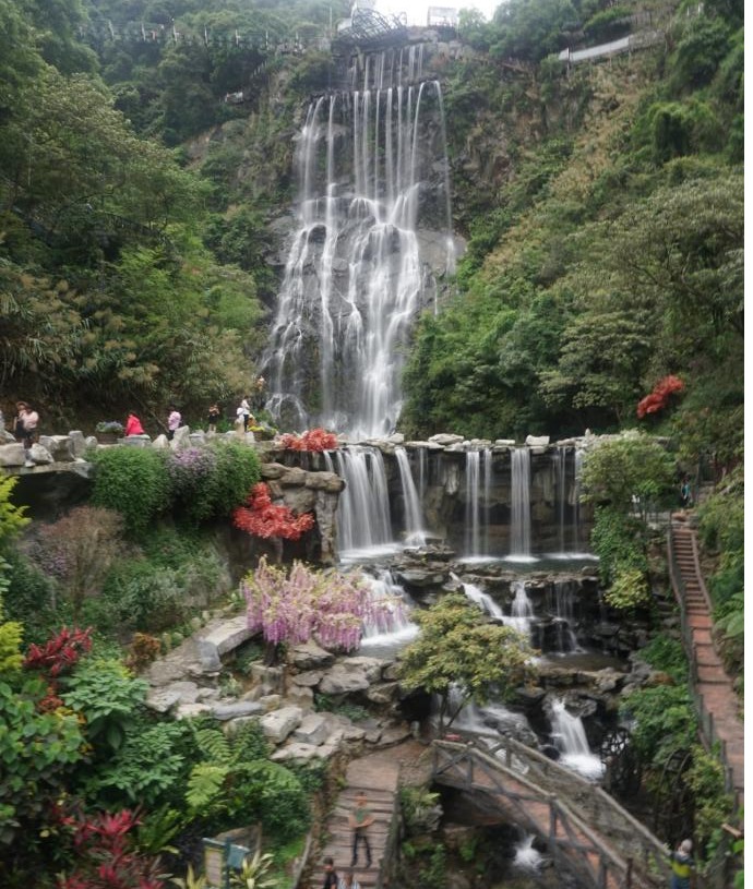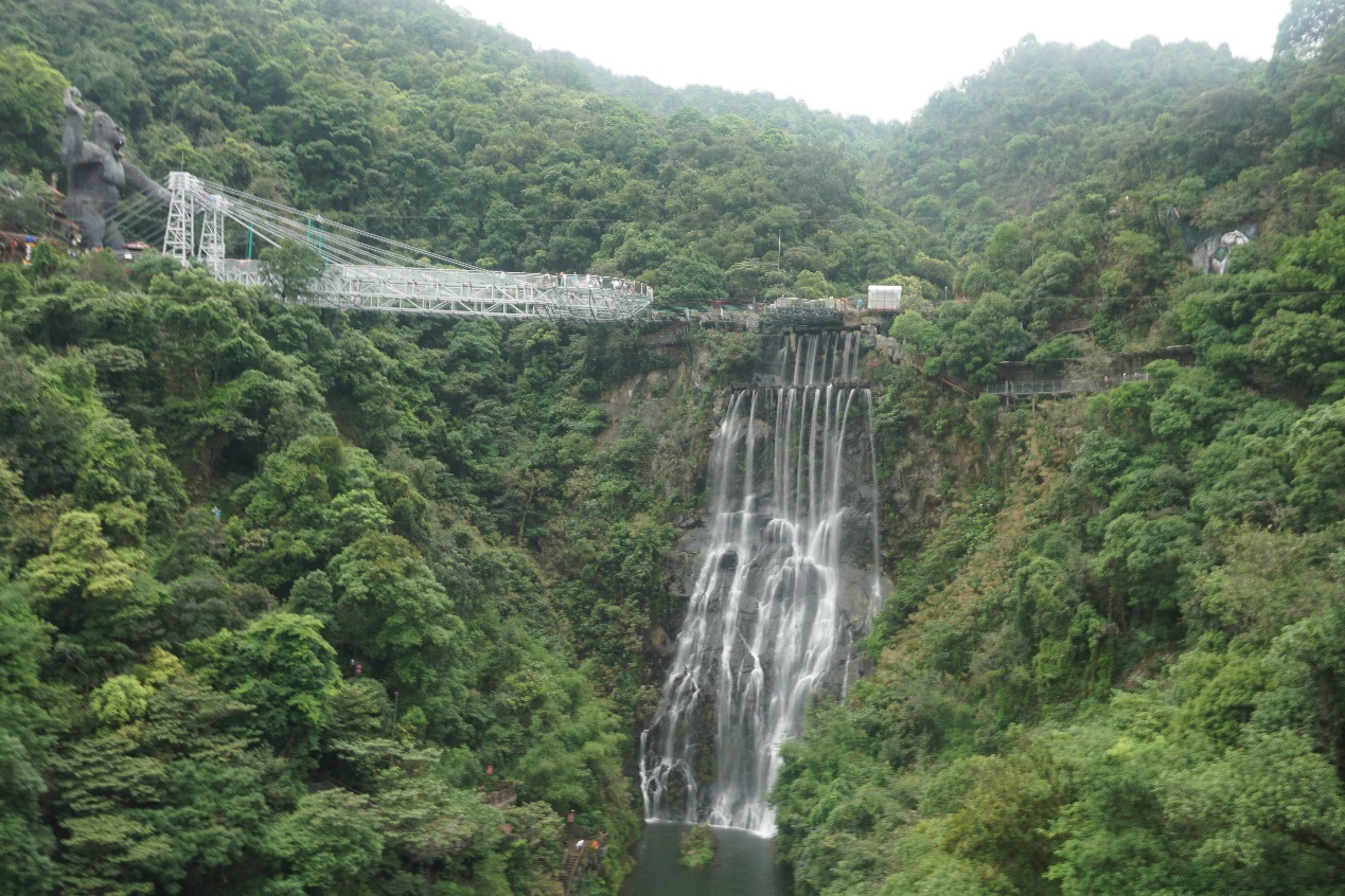 另一队的师生前往山上,观赏瀑布和游玩玻璃栈道。古龙九瀑又名万丈崖瀑布群,位于古龙峡河谷,长度610米,终年水流充沛,是国内落差最大的阶梯瀑布群。古龙九瀑顾名思义是由九段瀑布组成的浩大瀑布群,一瀑九曲,一曲一瀑,一折一潭,其中主瀑布为云龙大瀑布,单体落差131米,宽45米,犹如狂野的巨龙从天而降,气吞山河,在悬崖峭壁的撞击下,飞入峡谷激起惊涛骇浪。