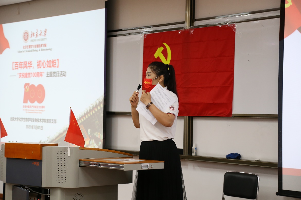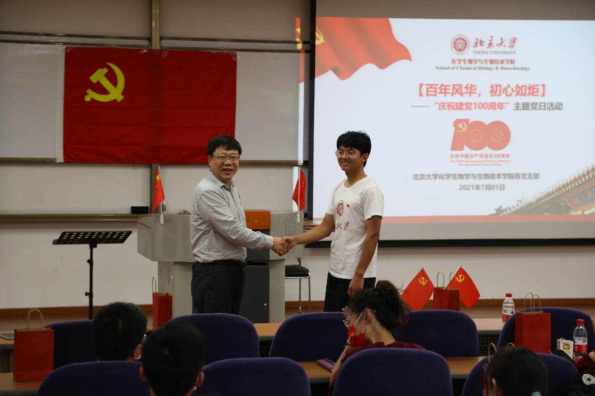 由2020级陈可为同学代表全体青年党员发言,杨震老师代表老一辈党员发言并对青年党员们寄予厚望。陈可为回顾了中国共产党领导中国人民赢得解放、进行经济建设以及战胜种种困难的光辉历史,并代表青年党员做出庄严承诺——面向未来,矢志不渝,走好新时代的长征路,为国家和人民交出一份份满意的答卷。杨老师回顾了自己成长的真实经历和入党的初心,告诫同学们北大人在祖国科学事业中的责任与担当,并向同学们发问:作为新时期的科研人,更是一名共产党员,怎样能为祖国科学事业的发展做出更大贡献?杨老师用“做蛋糕、分蛋糕”形象地比喻了共产党员在科技领域内的重要职责——利用科学技术创造更多社会价值并造福人民,让人民更广泛地享受到科技创新带来的福利。