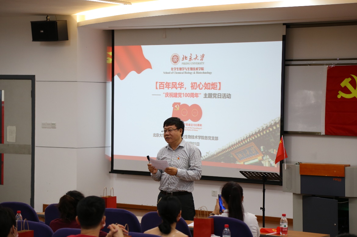 十点钟,庆祝大会圆满结束,主题党日活动正式开始。本次活动由化生学院教职工党支部书记赵亚波老师担任主持人, 深圳研究生院党委委员、常务副院长、化生学院院长杨震教授出席活动。首先,赵老师回顾了6月29日“七一勋章”表彰大会上习近平总书记的讲话,以此勉励同学们作为新时代的科研人,不仅要有高超的专业素养,更要有高尚的人文情怀,今后无论在哪个岗位上,都要将服务人民时刻牢记在心,努力为我们的社会创造新的价值,用一生勤恳的工作践行党旗下的誓言。