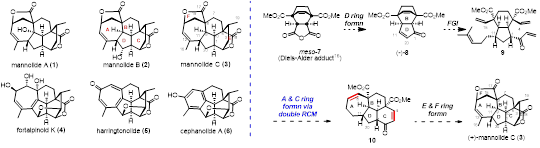 三尖杉二萜是一类分子结构丰富多样的天然产物,其中多个分子具有重要的生理活性,例如,海南粗榧内酯 harringtonolide (5) 具有优异的抗 KB 肿瘤活性(IC50 = 43 nm)。关于该分子,翟宏斌课题组数年前完成了其首次不对称全合成(Angew. Chem. Int. Ed. 2016, 55, 11638)。Mannolides A−C 是中国科学院上海药物研究所岳建民院士课题组从生长在西双版纳的粗榧类植物枝干和叶子中首次分离、发现的 cephalotane-type C20 三尖杉二萜天然产物,被认为是 harringtonolide 型降二萜和 cephanolide 型降二萜的生源前体。Mannolide C 具有复杂六环结构,具体包括一个高张力全碳 [7/6/6/5] 四环骨架、一个六元内酯和一个五元内酯;结构中共含有 9 个手性中心,其中 8 个为连续的手性中心, 2 个为全碳季碳手性中心(图1)。