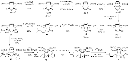 首先以易得的 meso-酸酐 7 为原料,通过亲核加成和原位脱水反应得到rac-烯醇内酯 11。化合物 11 依次经过内酯半还原、原位分子内 aldol 缩合反应、羟基甲磺酰化和消除反应生成 rac-烯酮 8。随后经过还原、Lipozyme TL IM酶催化的动力学拆分和氧化反应产生构型正确的烯酮 (-)-8,后者经过 Michael 加成、Wittig 反应和水解得到醛 14。化合物 14再进行一锅法缩醛和环氧保护、双键臭氧化、Wittig 烯化、Zn 介导的环氧还原和缩醛脱保护、乙烯基格氏试剂亲核加成和氧化生成双 RCM 反应的前体化合物 9(图 2)。