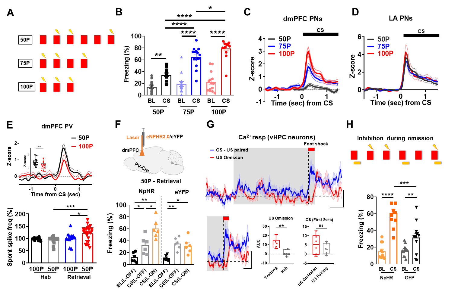 研究人员首先利用三种不同概率的条件性恐惧训练(50%,75%,100%; A),他们发现小鼠在行为上表现出相应的梯度的恐惧反应(B)。多通道神经元发电记录发现仅仅是在dmPFC出现了这种梯度反应(C),而在杏仁核(lateral amygdala)则没有(D)。进一步的光电极记录、离体膜片钳记录以及光遗传/化学遗传实验发现该梯度反应是由dmPFC PV神经元调控(E)。增高的PV神经元活性介导了概率记忆的表达,抑制dmPFC PV神经元可以影响概率记忆的编码和提取(F)。PV神经元是如何参与概率记忆的编码的?研究者发现vHPC的参与是需要的。通过光纤钙信号记录,他们发现vHPC在CS-US非匹配时会有瞬时的反应增强(G);而利用光遗传特异性的抑制该时刻的vHPC神经元(H),则会造成概率记忆不能形成。在检测记忆表达前或者训练后马上进行化学遗传抑制都不会影响概率记忆的编码与表达。这些结果表明vHPC的激活对于概率记忆的编码是关键的。