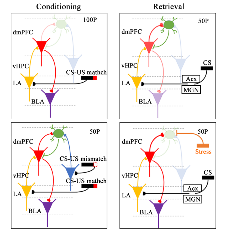 为了弄清概率恐惧记忆的表达能否被动态调节,作者在检测声音引起的恐惧反应前,将动物进行了两小时的束缚的压力应激处理。之前的研究表明压力会影响恐惧记忆的表达。作者发现经过这样处理的小鼠对声音所引起的恐惧记忆表达更加强烈,所表现出的CS-US 相关性更接近100%(即显著增高)。这个结果显示概率记忆的表达程度受到表达时刻动物所处的情绪状态的强烈影响。即动物在较大的压力、紧张或者恐惧的状态下将与记忆相关的信号(CS)解释为更高概率发生,或者更加负面/危险。他们进一步发现急性压力应激是通过抑制PV神经元活动而动态的增加恐惧记忆的表达强度。在更广的层面上,这个工作阐明dmPFC PV神经元在概率学习/记忆中的关键作用时通过整合不同输入而引起PV神经元的可塑性变化。鉴于PV神经元在诸多大脑疾病,特别是精神疾病中的至关重要的作用,这些发现也为理解这些疾病的机制与治疗提供了新的信息与见解。