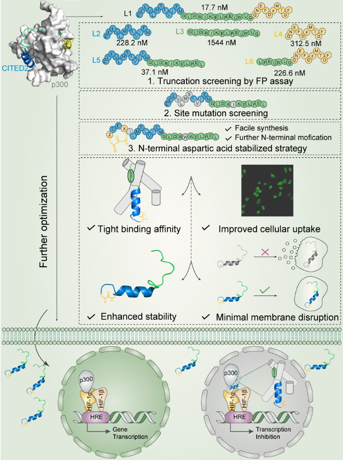 近日,李子刚/尹丰课题组利用本课题组开发的末端天冬氨酸的螺旋诱导的稳定多肽方法,筛选出了具有更高亲和力、良好细胞穿膜性和血清稳定性的多肽抑制剂,其成果发表在药物化学期刊《Journal of Medicinal Chemistry》上,题目为“Potent inhibition of HIF1α and p300 interaction by a constrained peptide derived from CITED2”。与已经报道的HIF1α衍生的多肽抑制剂不同,该工作从HIF1α的竞争蛋白CITED2蛋白出发,截取其与p300结合的最小序列片段进行了详细地研究。经过一系列的截短筛选和突变优化,最后得到一条具有更高亲和力和良好细胞穿膜性的线性多肽,并在此基础上使用末端天冬氨酸的螺旋诱导的稳定多肽方法,对线性多肽进行关环从而稳定其二级构象。实验结果表明,稳定多肽相对于线性肽在血清中更不易被降解,低氧条件下具有更强地抑制下游基因表达的效果。这一发现也为靶向HIF1α/p300 PPI 提供又一个可行的策略,为抑制相关肿瘤的生长及癌症的治疗提供了新的可能性。