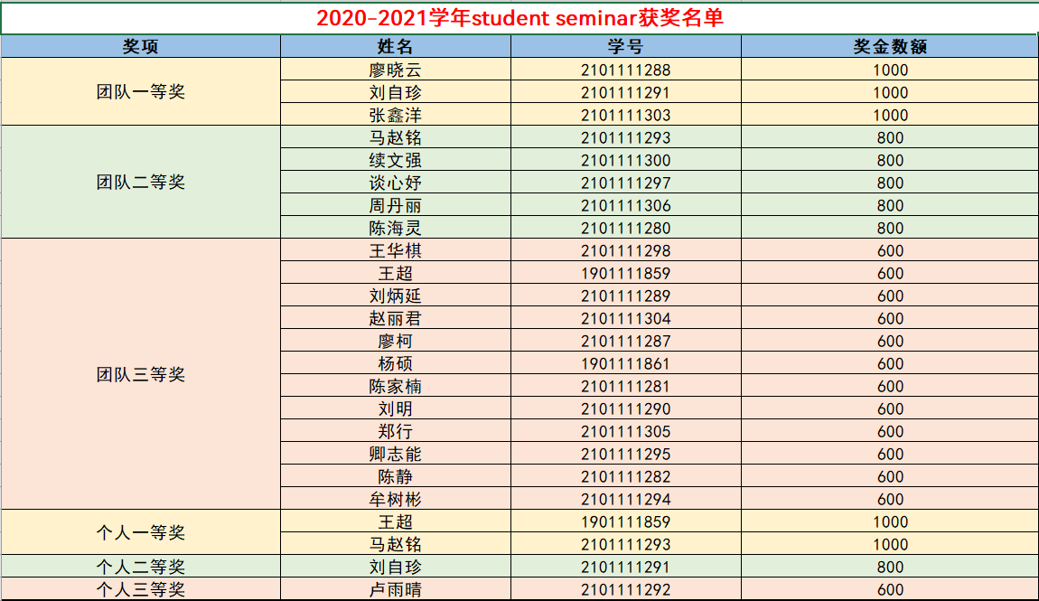 在综合了老师们与同学们的评价后,产生了本学年团队以及个人奖项的获奖名单。由李书鹏老师指导,廖晓云,刘自珍,张鑫洋三位同学组成的团队获得了一等奖;王超,马赵铭两位同学获得了个人一等奖;同时颁布的还有团队二等奖,团队三等奖,个人二等奖,个人三等奖等奖项。