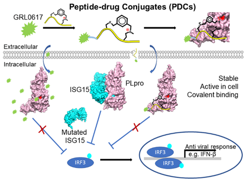 图1:共价靶向SARS-CoV-2 PLpro的多肽-药物偶联物(PDCs)示意图。