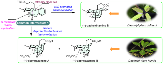 北京大学深圳研究生院化学生物学与生物技术学院翟宏斌课题组通过TiIII介导的自由基环化反应和分子内Heck反应等关键转化实现了一个共同四环核心(1)的高效不对称构建;其后采用发散式合成策略–––经区域选择性烯丙位氧化和串联的脱保护/烯酮还原/酮胺-半缩酮胺互变异构化反应实现了(-)-Daphnezomine A和(-)-Daphnezomine B的不对称全合成,通过区域选择性环氧开环、NIS介导的6-endo-trig碘胺化环化反应和自由基还原脱碘实现了(+)-Dapholdhamine B的不对称全合成。