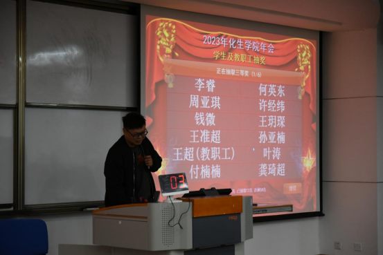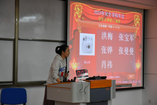 2023年3月28日下午,化生学院举办了2023化生学院年会学生及教职工抽奖活动,年会由化生学院鹿亚男老师主持,让全院学生、教职工欢聚一堂,共同回顾2022奋力拼搏的累累硕果,携手展望2023谋定未来的万象新篇,一起送上最美好的新春祝福。