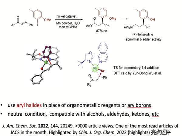 过渡金属催化的不对称共轭芳基化反应是合成天然产物和手性药物片段的重要手段之一。新的镍催化反应有如下几个优点:直接使用便宜易得的卤化物,避免了使用有机金属试剂如格式试剂和有机硼试剂,反应条件中性,与敏感极性基团和弱酸基团匹配如醛、酮、醇等(见下图)。