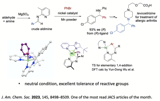 文章链接:Luoqiang Zhang, Xiuhua Wang, Maoping Pu, Caiyou Chen, Peng Yang, Yun-Dong Wu, Yonggui Robin Chi, Jianrong Steve Zhou. Nickel-Catalyzed Enantioselective Reductive Arylation and Heteroarylation of Aldimines via an Elementary 1,4-Addition, J. Am. Chem. Soc. 2023, 145, 8498–8509. DOI: 10.1021/jacs.3c00548.