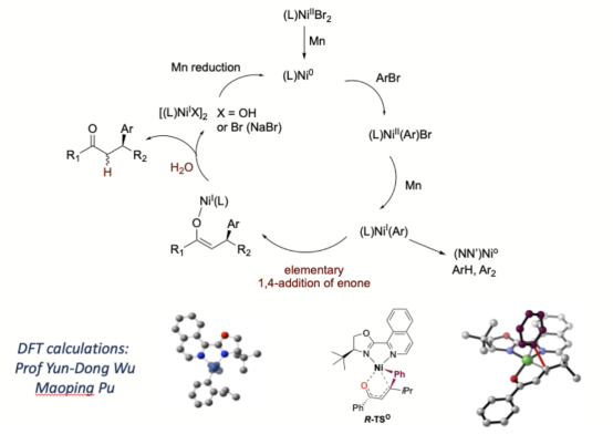 通过对芳基镍络合物的分离、表征和反应活性研究,结合DFT理论计算,作者们提出在催化循环过程中,一价芳基镍物种是加成反应的活性物种。更重要的是,其对烯酮的反应通过一种新的基元反应,1,4-加成而实现(见下图)。实验部分由张骆强博士(现在南洋理工大学池永贵教授课题组从事博士后研究)和研究生赵梦鑫合作完成,DFT计算由吴云东院士课题组蒲茂平博士完成。