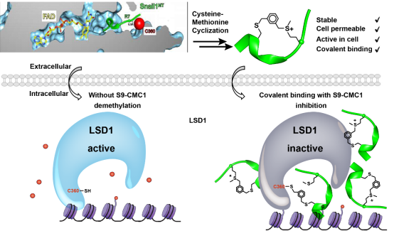 近日,北京大学深圳研究生院/深圳湾实验室坪山生物医药研发转化中心李子刚/尹丰课题组,最近在LSD1共价多肽抑制剂的开发中取得研究进展,研究成果已在药物化学权威期刊《Journal of Medicinal Chemistry》上发表,题为“ Covalent peptide LSD1 inhibitor specifically recognizes Cys360 in the enzyme active region”,利用本课题组开发的半胱氨酸-甲硫氨酸环化方法,首次报道了共价结合LSD1的半胱氨酸残基Cys360的多肽抑制剂。