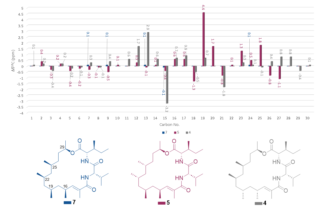 图2. 合成样品与天然样品的13C NMR数据比对结果。