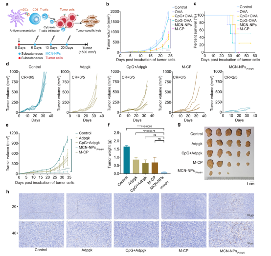 图2.纳米疫苗MCN-NPs用于B16-OVA和MC-38肿瘤治疗