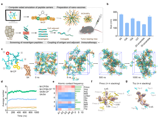 本研究瞄准新抗原肽在肿瘤免疫治疗中的临床应用限制,开发基于可逆“锍盐”关环的新颖多肽运载系统,用于免疫佐剂和肿瘤新抗原肽的共递送。首先,借助计算机辅助的模拟,解析核酸与“锍盐”关环多肽运载体互作的基本逻辑。研究发现多肽末端的Fmoc、Trp、序列中三个Arg和侧链关环,在诱导纳米复合物组装以及维持复合物结构稳定时发挥关键作用。进一步,通过调整关环、序列顺序等筛选获得了可用于核酸佐剂CpG-抗原肽偶联物递送的多肽运载体M-CP。