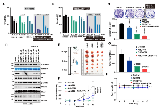 团队进一步验证USP7不仅能够调控野生型KRAS,同时对可导致肿瘤的KRAS多种G12突变体(G12C,G12D,G12A,G12S,G12V),以及GTP,GDP结合状态的KRAS,有类似的亲和力及去泛素化稳定作用。为了深入研究靶向USP7在KRAS突变介导的NSCLC治疗中的作用,团队构建了对KRAS G12C抑制剂AMG510耐药的NSCLC-AMGR细胞系。结果表明,USP7抑制剂能在体外抑制NSCLC-AMGR细胞增殖,在动物模型中USP7抑制剂与KRAS抑制剂的联合使用促进了NSCLC-AMGR肿瘤在体内的消退,表现出了显著的协同增效作用(图1)。