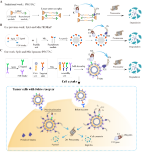 PROTAC技术具有靶向不可成药靶点、高催化活性、克服耐药性等优势,已成为药物研发的新战略,为疾病的治疗提供了新方法。传统PROTAC的设计与合成需要耗费大量时间和资源,这使其在药物开发和应用中受到限制。为了解决这些瓶颈,研究人员一直在积极探索,以开发更具特异性和效力的PROTAC分子。在这一背景下,北京大学深圳研究生院的李子刚/尹丰课题组另辟新径提出了一种新的多肽分合(Split-and-Mix)纳米自调节平台(SM-PROTAC),该平台具有易于筛选投入组装分子和组装分子的比例、普适性强、节省时间等优势,但是多肽起效降解浓度较高[1](J. Am. Chem. Soc. 2023, 145, 7879-7887,DOI: 10.1021/jacs.2c12824)。为了寻找一种更适用于SM理念的体系,李子刚/尹丰课题组开发了一种新的基于脂质体的分合(Split-and-Mix)纳米自调节平台(LipoSM-PROTAC),在生物学领域进行验证发现起效浓度比多肽SM-PROTAC低50-100倍,且具备叶酸选择性递送的特性,能够精准靶向特定细胞系,表现出卓越的生物安全性,同时具备巨大的临床转化潜力,广泛适用于多个生物应用领域。该研究成果题为“Selective Protein of Interest (POI) degradation through split-and-mix liposome PROTAC approach”(DOI:10.1021/jacs.3c05948)发表在Journal of the American Chemical Society(JACS)杂志上,并被选为封面文章。