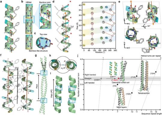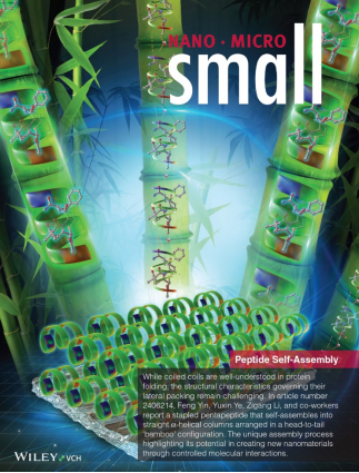 近年来,多肽自组装因其具有良好的生物相容性、灵敏的响应性及特定的生物功能而备受关注。因此,基于多肽分子简单结构的直观设计,其被用作超分子自组装的仿生学构建块已经取得了显著的进展。多肽自组装在特定情况下能形成规则有序的纳米结构,表现出不同于单分子的优势和特性,已广泛应用于细胞培养、组织工程和药物递送等领域。在天然氨基酸序列的基础上,多肽有可能表现出分子内二级结构是比较有限的,其中α-螺旋是常见的二级结构,且通常关注于卷曲螺旋(coiled coils),然而,其侧向堆积的结构特征仍然存在诸多未解之谜。李子刚/尹丰课题组利用前期设计开发的一种手性诱导螺旋多肽(Chirality-induced-helix,CIH)系统,实现了一种类似于“竹节”结构的直链多肽自组装(图1)。本研究结果以Frontispiece(卷头插画)文章的形式发表于《Small》期刊。