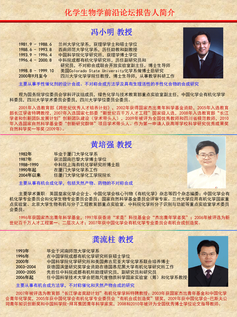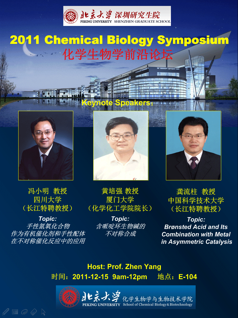 应用 黄培强教授:含哌啶环生物碱的不对称合成 龚流柱教授:Brønsted Acid and Its Combination with Metalin Asymmetric Catalysis 时间:12月15日(下周四)09:00-12:00AM 地点: E-104