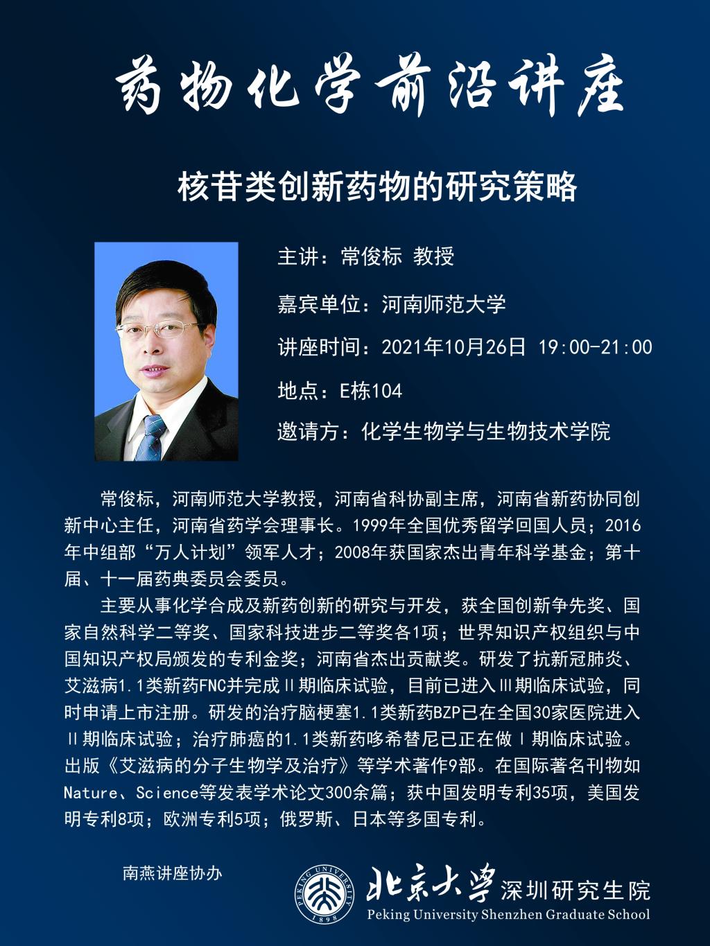 2021年10月26日(周二),翟宏斌老师邀请了河南师范大学的常俊标教授到访我院并进行药物化学前沿讲座。欢迎大家参加!