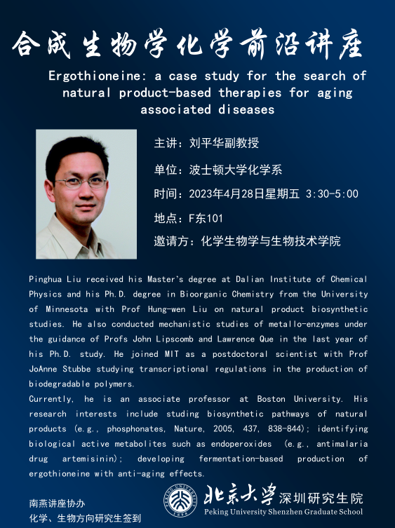大家好,2023年4月28日(星期五),化学生物学与生物技术学院邀请了波士顿大学刘平华副教授到访我院并进行“Ergothioneine: a case study for the search of natural product-based therapies for aging associated diseases”的讲座,欢迎大家参加!